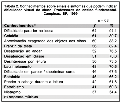 Em relação ao conhecimento sobre os sinais e sintomas indicativos de dificuldade visual, todos os professores apresentaram respostas. A maioria (94,1%) reconheceu a dificuldade para ler na lousa como causa de problema visual. Como se observa na tabela 2, também é significativo o número de professores que indicam a cefaléia (89,7%) e a aproximação exagerada dos objetos aos olhos (88,2%) como causas de dificuldade visual. As opções menos apontadas dizem respeito ao estrabismo (60,3%) e ao nistagmo (54,4%). Quanto à detecção de escolares com dificuldades visuais, 38 (55,9%) dos professores respondentes mencionaram ter realizado a identificação em sala de aula.
