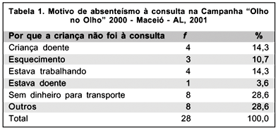 A Campanha "Olho no Olho", realizada em 2000, nas escolas da rede estadual, em Maceió, teve um alto índice de comparecimento à consulta (89,35%), e boa participação dos pais conduzindo os filhos à consulta (82,98%). A consulta médica realizada em mutirão nas escolas da região e aos sábados, tendo os pais como principais acompanhantes dos escolares, pode facilitar a compreensão desses pais sobre a necessidade do uso dos óculos na infância, com o seu reforço em casa, especialmente se for aproveitado o momento para melhor informá-los sobre saúde ocular.