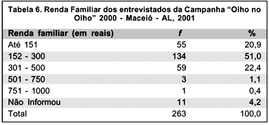 Dos entrevistados, 69,96% eram mães das crianças e 66,92% sabiam ler. A renda da família era até 151 reais (1 salário mínimo na época) em 20,91% dos entrevistados, entre 152 e 300 reais em 50,95% e entre 301 e 500 reais em 22,43% (Tabela 6). Referiram uso de óculos 15,59% dos respondentes.