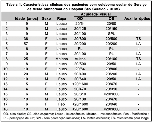 Foram encontrados 18 pacientes (0,75%) com coloboma ocular de um total de 1325 pacientes matriculados no Serviço de Visão Subnormal no período de janeiro de 1992 a dezembro de 2001. Destes, oito (44,4%) eram do sexo masculino, sendo 10 ( 55,6%) do sexo feminino. A idade variou de 4 a 57 anos, com média de 9,5 anos. Quanto à cor, 15 (83,3%) eram leucodérmicos, 2 (11,1%) feodérmicos e apenas um (5,6%) melanodérmico (Tabela 1).