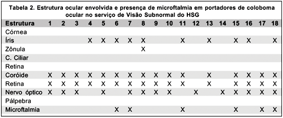 O acometimento foi bilateral em todos os pacientes estudados (100%), sendo que a microftalmia esteve presente em 6 (33,3%) e não houve caso de anoftalmia. O coloboma se apresentava típico, nasal inferior, em 14 pacientes (77,8%) e atípico em 4 (22,2%). Quanto à localização do coloboma 16 pacientes (88,9%) apresentavam coloboma retinocoroidal, 14 (77,8%) coloboma de nervo óptico, 10 (55,6%) coloboma de íris, 2 (11,1%) coloboma de mácula e apenas 1 (5,6%) coloboma de zônula e corpo ciliar (Tabela 2).