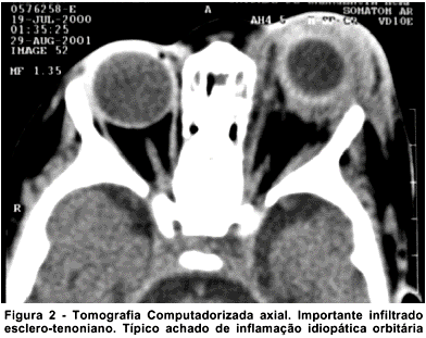 A TC é de fundamental importância na diferenciação entre celulite orbitária e IOIA. No primeiro caso, geralmente há sinusopatia concomitante e as imagens sugerem infiltração difusa da gordura orbitária, descolamento da periórbita (abscesso subperiósteo) ou sinais de abscesso intra-orbitário. O quadro radiológico da paciente era distinto. Não havia sinusopatia e na órbita detectava-se uma infiltração predominantemente periescleral, achado típico das IOIA anteriores(6-7).