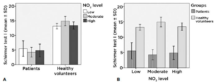 Among patients with different levels of exposure, we found no significant changes (Figure 2A). On the other hand, with similar levels of exposure patients presented less lacrimal secretion, a phenomonon justified by their ocular surface pathology (Figure 2B).