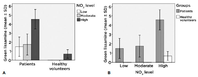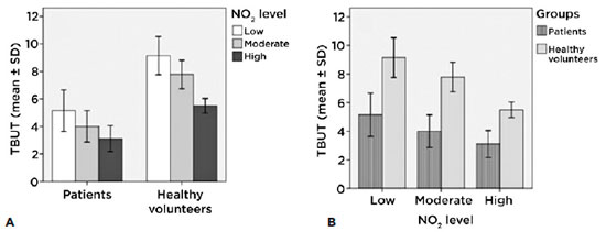 We divided the patients and the control group according to NO2 exposure levels: high exposure (NO2 >30 µg/m3), moderate exposure (20 µg/m3 to 30 µg/m3), and low exposure (NO2 <20 µg/m3). We performed one-way ANOVA with the Bonferroni test as the post hoc test (α=0.05) to compare means within groups. We also performed the independent samples T test (α=0.05) to compare means between patients and the control group exposed to the same levels of NO2 (high, moderate or low). We used SPSS 17.0 (WinWrap Basic, Copyright 1993-2007 Polar Engineering and Consulting) to perform the statistical analysis and to create the graphics.