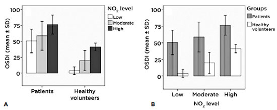 The only a significant difference we found in the patients group (intragroup) in the OSDI was between low and high exposures (p<0.01); in the healthy volunteer group (intragroup) there was a significant difference between all three groups (p<0.01) (Figure 1A). The intergroup figure clearly shows that, with a similar level of exposure, patients presented a higher symptom score according to the OSDI questionnaire than did the control group (p<0.01) (Figure 1B).