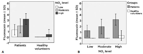 We found significant differences between patients (intragroup) with low levels of exposure and those with high levels of exposure (p<0.001), and between those with moderate levels of exposure and high levels of exposure (p<0.001). In the healthy volunteer group (intragroup) we found significant differences between low levels of exposure and high levels of exposure (p<0.001) (Figure 4A). These results clearly show a connection between the level of exposure to NO2 and ocular surface damage.