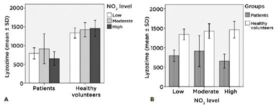 We found no significant differences as regards lacrimal lysozyme among patients (intragroup) at each level of exposure, nor among the control group (intragroup). Lysozyme levels were not affected by NO2 exposure because patients with Sjögren dry eye syndrome present low levels of this enzyme (Figure 7A).