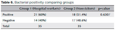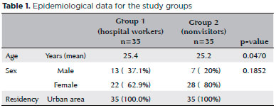 Methods: Two groups (35 patients per group) were included, consisting of hospital workers and those who had not visited a hospital in the past 30 days, and a questionnaire regarding epidemiological data and habits related to contact lens and lens case use was administered. In addition, 140 samples collected from the right and left compartments of each lens case by swabbing the bottom of the wells were tested using bacterioscopy as well as fungal and bacterial cultures via computerized identification of the species.