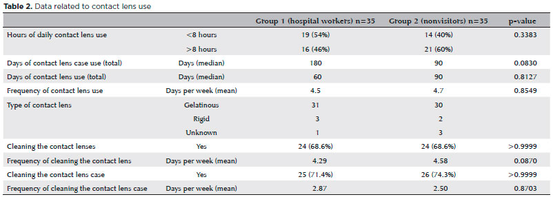 Métodos: Dois grupos foram formados, trabalhadores do hospital e pessoas que não visitaram o hospital (35 indivíduos por grupo), e um questionário foi aplicado sobre dados epidemiológicos e hábitos relacionados ao uso de lentes de contato e estojos de lentes. Além disso, 140 amostras, coletadas do compartimento direito e esquerdo de cada estojo de lente, esfregando o fundo dos mesmos, foram testadas por bacterioscopia e por culturas de fungos e bactérias, com identificação computadorizada da espécie.