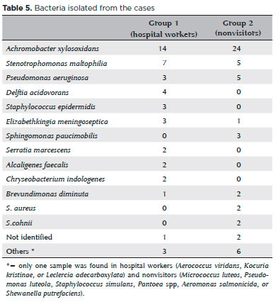 The microorganisms found in each group were similar. Bacteria isolated only in Group 1 included Serratia marcescens(17), Staphylococcus epidermidis(18), Chryseobacterium indologenes(19), Delftia acidovorans(20), Leclercia adecarboxylata(21), Kocuria kristinae(22), Aerococcus viridans(23), and Alcaligenes faecalis(24). With the exception of S.marcescens, these bacteria mostly have low virulence but may present high resistance to common antibiotics and may seriously affect immunosuppressed patients.