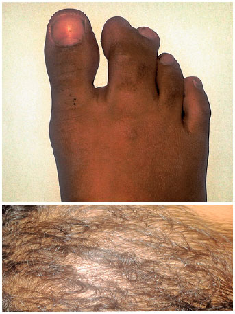 EEM syndrome is characterized by scarce hair at birth with little growth during the patients’ life, and some patients may have dental anomalies. Limb malformations may present significant phenotypic variability among previously reported cases(5,6). Macular dystrophy develops with significant progressive loss of visual acuity between the ages of 16 and 20 years(6).