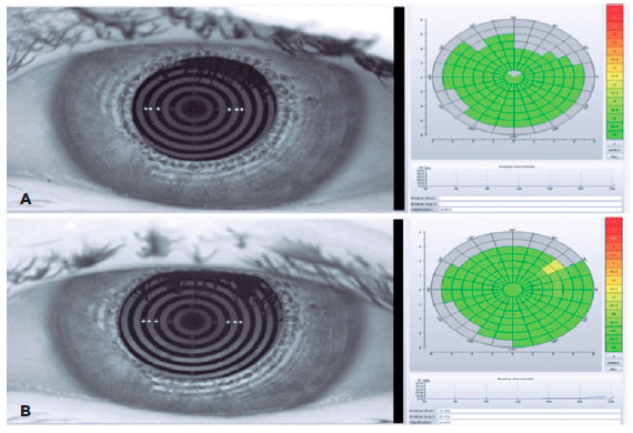 The patients underwent a complete ophthalmological examination before and 6 weeks after surgery, with slit-lamp evaluation, searching for signs of dry eye. At the time of these examinations, objective noninvasive examination of the tear film was performed with the use of the Keratograph 5M. To avoid the effect of fluorescein on the tear film, the evaluations with the Keratograph 5M were performed before the conventional ophthalmological examinations.