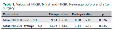 Resultados: A idade média de idade dos pacientes foi de 65,1 anos (variação entre 51-84); 86% eram do sexo feminino. O teste t de Student foi usado para comparar os valores não-invasivos do tempo de ruptura lacrimal do Keratograph 5M e do tempo de ruptura lacrimal não invasivo do mesmo antes e após a cirurgia. Os valores não-invasivos do tempo de ruptura lacrimal do Keratograph 5M avaliados antes e após a cirurgia não foram significativamente diferentes (9,04 e 8,71, respectivamente; p=0,926). Os valores do tempo médio de ruptura lacrimal do Keratograph 5M avaliados antes e após a cirurgia, também não foram significativamente diferentes (13,01 e 13,14 segundos, respectivamente; p=0,835).