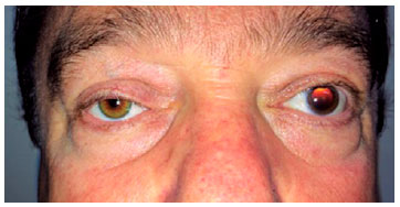 Choroidal melanoma metastasis to the fellow eye is an extremely rare and aggressive phenomenon, with fewer than 10 published case reports(1-6). There are three distinct theories that may shed light on the pathobiology of bilateral choroidal melanoma: the contralateral choroidal tumor may be a metastatic tumor from the primary choroidal melanoma in the first eye; both tumors may be metastatic in origin from a primary cutaneous or visceral melanoma; both choroidal melanomas may be primary tumors(5,7,8).