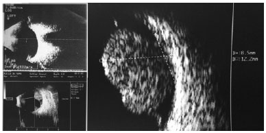 At his 17-month post-operative follow-up, the patient presented to his treating physician complaining of progressive left eye vision loss and retrobulbar pain over the past six months. Left eye ultrasonography was performed at that time. The results were normal. After three months, a second ultrasound revealed a mushroom-shaped choroidal mass with low internal reflectivity and thickness of 7.4 mm. Serous retinal detachment was noted.