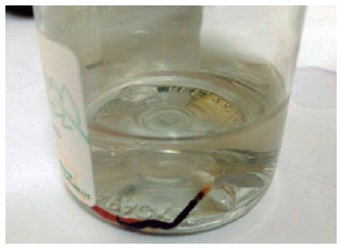Figure 3. Liver biopsy macroscopic fragment showing the black color of the metastatic lesion and the brown color of another fragment from the area beyond the lesion. The black color of the tissue is highly suggestive of metastatic melanoma (confirmed by pathological analysis).