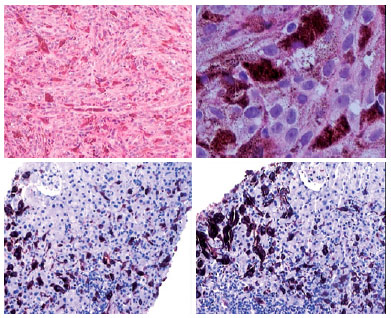 Figure 4. Pathology and immunostaining confirming the liver fragment was metastatic melanoma. Upper left: H&E 100×; upper right: H&E 400×; lower left: positive melan A; lower right; positive HMB45.