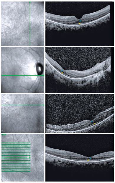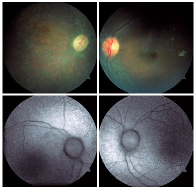 There was positive correlation between morphological and functional findings. That is, retinal dystrophy and associated retinal findings, as assessed by SD-OCT, were in agreement with the electrophysiological findings. SD-OCT analyses demonstrated a single layer of undifferentiated and immature photoreceptors in the foveal zone with atrophy mainly of the peripheral retinal external layers (Figure 2). In addition, abnormal persistence of internal retinal layers occurred in the central foveal zone. Changes in FAF are poorly standardized in AS. In the presented cases, however, there was evidence of hyperautofluorescence areas and hypoautofluorescence spots suggesting, respectively, involvement and atrophy of retinal pigment epithelial cells. Electrophysiology demonstrated early dysfunction followed by rapid rod deterioration in advanced stages of disease with no response to scotopic and photopic stimuli leading a mixed dysfunction of photoreceptors(10) (Figures 1 and 3).