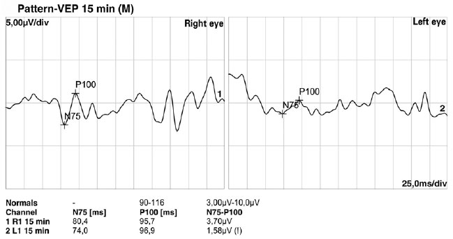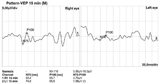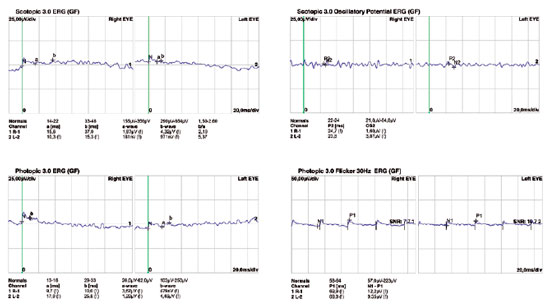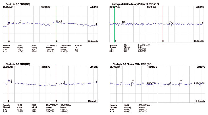 Fundoscopic findings showed optic disc pallor, narrowing of retinal vessels, and peripheral bone spicules (only in cases 3 and 4) in OU of all patients. FAF showed smooth hyper/hypoautofluorescence macular mottling (Figure 1), while SD-OCT demonstrated, in all cases, areas of outer retinal layer atrophy and central retinal thinning (Figure 2). Electrooculography demonstrated an Arden index of >1.8, besides absence of ERG registered scotopic and photopic stimuli (ARSP) responses with reduction of flicker electroretinography at 30 Hz. Reduction of amplitude and preserved latency occurred in evoked visual potential (Table 1, Figures 3 and 4).