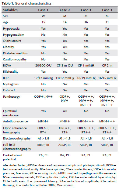This study describes ophthalmological findings of AS in a series of cases, which included visual acuity impairment since the first decade of life, nystagmus, photophobia, blepharospasm, optic disc pallor, narrowing of the retinal vessels, retinal pigmentary epithelium mottling, peripheral retinal bone spicules, and epiretinal membranes(7,10), besides obesity, short stature, diabetes, deafness, and absence of mental retardation. Male hypogonadism, an atypical sign(7), was present in two patients (Table 1).