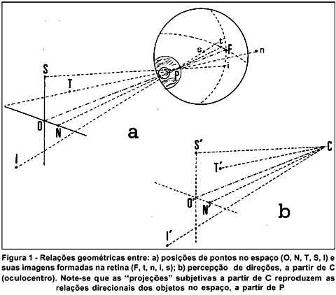 A essa linha abstrata, mas unívoca, entre o objeto no espaço e sua imagem na retina, corresponde uma localização subjetiva do elemento gerador do estímulo, sua direção visual. Objetos cujas imagens formam-se sobre a fóvea, são percebidos "em frente" do olho, têm a chamada direção visual principal, ou linha visual principal (que tem, como correlato físico, o eixo visual), uma espécie de eixo referencial, relativamente ao qual as demais localizações espaciais são referidas. Objetos no campo visual nasal (N, figura 1a), têm suas imagens formadas na retina temporal (t , figura 1a), cuja percepção é a do objeto situado no respectivo lado nasal do olho (N¢, figura 1b). Objetos no campo superior (S, figura 1a), formam imagens na retina inferior (i, figura 1a) sendo a imagem então percebida do lado superior desse olho, etc (figura 1).