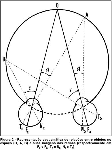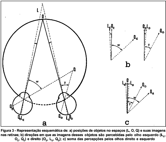 A visada de um ponto objeto no espaço é normalmente provida pelos dois olhos, simultaneamente, de tal sorte que suas imagens se formem sobre as fóveas (tendo, por conseguinte, as mesmas direções visuais "em frente"). Outros objetos poderão ter suas imagens formadas em pontos retínicos correspondentes, isto é, os com idênticas direções visuais (relativamente à principal), ou não. No primeiro caso, cada objeto (O, A, B, figura 2) será percebido de modo único, enquanto os que têm imagens formadas em locais retínicos não correspondentes (L, Q, figura 3a), serão notados em duas localizações espaciais (diplopia). Os objetos cujas imagens são formadas em locais retínicos correspondentes dispõem-se sobre uma linha imaginária, o círculo de Vieth e Müller, cujo traçado passa pelo ponto principal de fixação (O, figura 2) e pelos pontos nodais de cada olho (PE e PD). Tal círculo é a representação teórica do conceito de horóptero, a região do espaço cujos objetos nela situados estimulam pontos retínicos correspondentes, sendo então percebidos univocamente. Fora do horóptero (figura 3a), haverá diplopia (figura 3c). Para objetos situados além do horóptero (L, figura 3a), a diplopia é homônima: a imagem mais à direita (LD) é a formada pelo olho direito e a mais à esquerda (LE) formada pelo olho esquerdo (figura 3c)(***). Para objetos situados aquém do horóptero (e.g., o ponto Q, figura 3a), a diplopia é cruzada: a imagem mais à esquerda é a do olho direito (QD)e vice-versa (figura 3c).