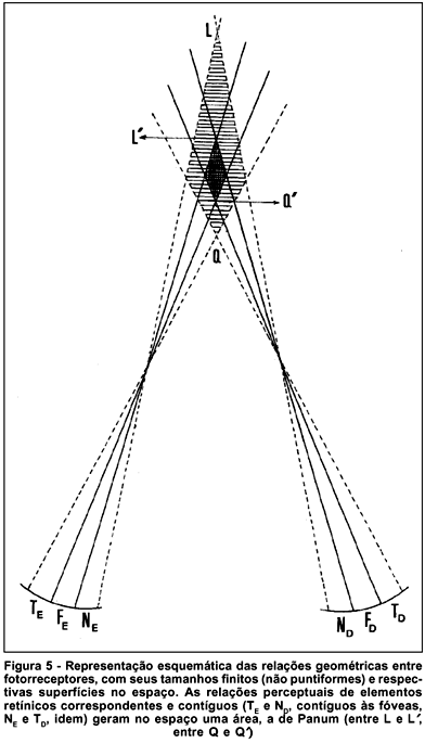 A concepção geométrica pela qual pontos do espaço são relacionados a pontos da retina, gerando linhas de correspondência visual (os horópteros) não é sustentável: os elementos retínicos responsáveis pela transdução dos estímulos físicos (luz) a sensações (o sinal neural) são os fotorreceptores e suas conexões, formando áreas relativamente extensas, os chamados campos receptivos. Mesmo na fóvea, em que o tamanho desses campos receptivos é mínimo (a área de secção transversal de cada cone foveal) a relação está, portanto, longe de ser puntiforme. Resulta que a cada um desses elementos fotorreceptores não cabe uma linha de direção visual, mas um feixe delas, formando uma figura cônica (figura 5a). Ao redor dos pontos que formariam a linha do horóptero (relacionada ao ponto central de cada um desses elementos), o entrecruzamento de tais feixes cônicos dos respectivos elementos de cada olho, perceptualmente correspondentes, gera um sólido, cuja secção no plano de estudo considerado (por exemplo, o horizontal) é uma superfície plana, a área de Panum (figura 5a). Pelo fato de os campos receptivos serem maiores na periferia do que na região central, a área de Panum não é uniforme. No centro é pequena (estimada em cerca de 15 minutos de arco, desde o limite interno ao externo)(8-9), estendendo-se à medida que regiões mais periféricas forem consideradas (figura 5b). Mas de qualquer modo, valores maiores para a área de Panum foram relatados também para a região central, na dependência do método usado(10). Os pontos do espaço contidos numa área de Panum delimitada pelas linhas de direção visual referentes aos contornos dos campos receptivos (elementos visuais) correspondentes possuem, pois, uma só, idêntica, direção visual. São então vistos unificadamente; e apenas além e aquém dessa superfície (e não de uma linha divisória do espaço) é que se tornaria demonstrável a diplopia.