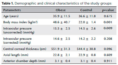 The morbid obesity group (n=101) and healthy control group (n=95) were well matched for age (35.9 ± 11.5 years, range 14-63 years vs. 36.6 ± 11.8 years, range 14-63 years; p>0.05) and sex ratio (68 females and 33 males vs. 67 females and 28 males; p>0.05). The mean uncorrected IOP was significantly greater in the obese group (15.5 ± 2.5 mmHg vs. 14.5 ± 2.6 mmHg; p=0.009), whereas AL, ACD, and CCT did not differ. Demographic and clinical characteristics of the study groups are summarized in table 1.
