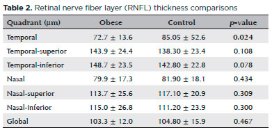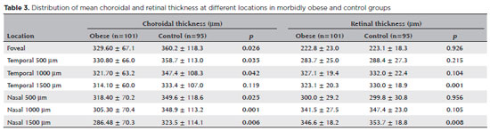 Resultados: A pressão intraocular não corrigida foi significativamente maior no grupo com obesidade mórbida do que no grupo controle saudável (15,5 ± 2,5 vs. 14,5 ± 2,6 mmHg, p=0,009), enquanto que o comprimento axial, profundidade da câmara anterior e espessura central da córnea não diferiram entre os grupos. A espessura média da camada de fibras nervosas da retina no quadrante temporal foi reduzida no grupo com obesidade mórbida (72,7 ± 13,6 vs. 85,05 ± 52,6 µm, p=0,024). Da mesma forma, a média das espesuras da retinianas nas localizações nasal e temporal de 1500 µ foi menor no grupo com obesidade mórbida (346,6 ± 18,2 µm vs. 353,7 ± 18,8 µm, p=0,008; 323,1 ± 20,3 µm vs. 330,0 ± 18,9 µm, p=0,001). A espessura média da coroide também foi reduzida em quase todos os locais de mensuração (fóvea, temporal 500 e 1000 µm, nasal 500, 1000 e 1500 µm) do grupo obeso (p<0,05). Peso e índice de massa corporal foram negativamente correlacionados com a espessura da coroide subfoveal (r=-0,186, p=0,009; r=-0,173, p=0,015).