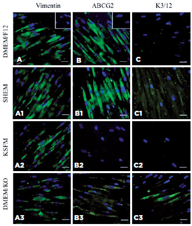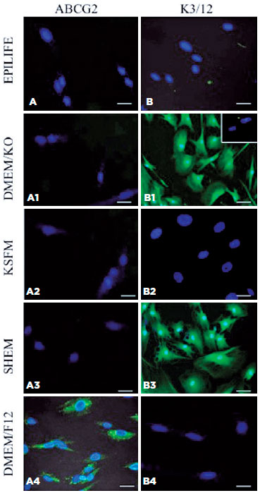 The ABCG2 antibody exhibits a strong positive reaction in hIDPSC cultured in D-MEM/F-12 or SHEM (Figures 3B and B1); however, it does not bind to hIDPSCs cultured in KSFM (Figure 3B2) and reacts weakly with hIDPSCs grown in D-MEM/KO (Figure 3B3). The anti-K3/12 antibody does not react with hIDPSCs cultured in D-MEM/F-12 or KSFM (Figures 3C and C2) and shows very weak immunopositivity in cells maintained in SHEM or D-MEM/KO (Figures 3C1 and C3).