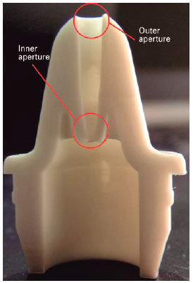 A computerized visual inspection system was used to measure the dimensions of the outer and inner apertures. Tests were conducted on lubricating eye drops available in the Brazilian market, which were designated as “brand A” and “brand B” and chosen on the basis of the lowest price. We inspected ten 15-mL bottles from two different brands, five bottles from each brand and from different batches. Figure 1 illustrates the cross-section of the eyedropper tip; the external opening is in the upper portion of the tip, which is easily visualized by the user, and the inner aperture is in the lower portion of the tip, inside the eyedropper.