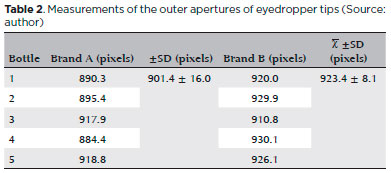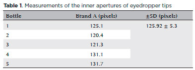 Most drugs used to treat eye diseases are aqueous solutions containing active ingredients (eye drops). These medications are applied using a wide range of eyedroppers with different types of tips that allow slow dropwise administration of the drug(17). Studies suggest that the lack of uniformity in dropper size results in medication wastage(18,19) because the dropper size should be determined based on the maximum capacity of the conjunctival sac (20 µL)(20). Here, we aimed to evaluate variations in the diameters of the outer and inner apertures of eyedropper tips using a computer vision system.