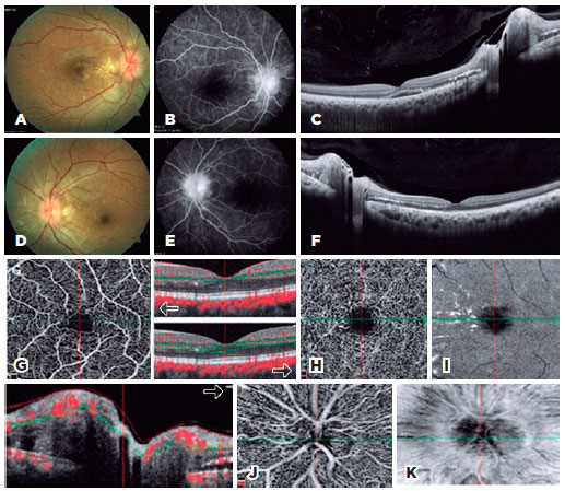 A 33-year-old male presented to our clinic with low vision in both eyes that had started during the previous week. Visual acuity was 20/63 in the right eye and 20/50 in the left eye. Intraocular pressure was 13 mmHg in both eyes, and examination of the anterior segment was normal. Fundus examination showed bilateral optic disc edema, star-like hard exudates around the optic disc and fovea, arteriovenous changes, and a few flame-shaped hemorrhages (Figure 1 A, D). In addition, RPE changes including Elschnig spots were visible outside the arcuate. FFA revealed bilateral optic disc hyperfluorescence increasing in the late phase and hypofluorescence in the zones we thought to be Elschnig spots (Figure 1B, E). Macular thickness measurements using SD-OCT revealed increased thickness. Increased reflectivity and SRF were seen on the nasal side of the macula because of the hard exudates (Figure 1 C, F). Measurements of subfoveal choroidal thickness measurements were performed using enhanced depth imaging optical coherence tomography (EDI-OCT). Retinal nerve fiber layer (RNFL) measurements revealed an increase in each quadrant in favor of optical disc edema (Table 1). OCTA macula was used to evaluate superficial, deep capillary density and en face images (Figure 1 G, H, I). OCTA disc was used to evaluate the nerve head, radial peripapillary capillary density, and en face images (Figure 1 J, K). Vascular flow was assessed in both the macular and disc regions (Tables 1 and 2).