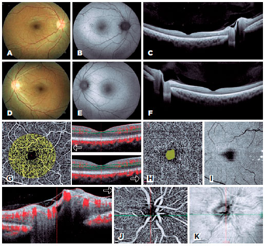 Optical coherence tomography angiography (OCTA, Optovue, Inc., Fremont, CA, USA) is an imaging method for the in-depth evaluation of retinal and choroidal vessels and may be useful in cases when fundus fluorescein angiography (FFA) is relatively contraindicated (e.g., renal failure).