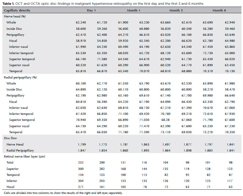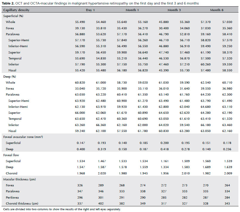 Rotsos et al. assessed choroidal blood flow at Elschnig points with OCTA and reported the results at 1 month(8). Similarly, Saito et al. compared focal choroidal ischemic areas and reperfusion in hypertensive choroidopathy following treatment with en face OCTA images(9). Both studies did not assess capillary density, FAZ, or flow. Grossi et al. compared OCTA results between the arterial hypertensive and normotensive group. Patients in the normotensive group had thicker choroids, whereas no vascular density differences were found(10). They emphasized that OCTA was potentially useful for detecting early pathological damage and assessing progression.