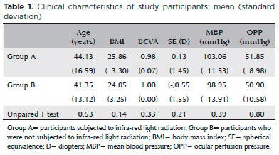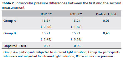 The ethics committee of our hospital approved our study and the study was in accordance with the tenets of the Declaration of Helsinki. Initially the study included 34 healthy subjects (age 24-59) who all signed informed consent before participation. Exclusion criteria were: systemic diseases, ametropia >6D, IOP >21 mmHg, ocular acute or chronic pathology and any intraocular surgery. Best corrected visual acuity, auto-referactometry, slit-lamp biomicroscopy, blood pressure (automated sphygmomanometer-Sanitas) and IOP (Goldman applanation tonometry (AT)) was performed in all participants. The IOP measurement was recorded after averaging at least two measurements with the AT. Two subjects were excluded because of IOP >21 mmhg. One (right) eye per patient was included in the study. After the initial examinations, subjects were assigned to either group A (n=17) subjected to IRL radiation or group B (n=17) not subjected to IRL radiation. The IRL radiation involved 15 minutes of continuous effect of a 150 W IRL bulb (General Electric E27 that emits mixed IRL with mainly shorter wavelengths (mid IRL, near IRL and visible red light)) on a distance of 40 cm. Participants who did not receive any IRL radiation spent equal time in the same conditions as participants in group A. Immediately after the procedure subjects had their IOP measured again by Goldman AP by a masked examiner (GD). We used unpaired t-test to analyze statistical differences between group A and group B and paired t-test to analyze the differences between the first and the second IOP measurement in each patient group. P values <0.05 were considered as statistically significant.