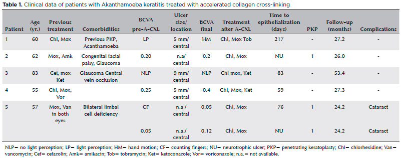 AK is a sight-threatening condition that requires difficult and prolonged treatment. The infection and accompanying inflammatory reaction may lead to ulceration, corneal melting, and perforation if not treated adequately. CXL may useful for the treatment of infectious keratitis with corneal melting(14). However, there are a limited number of cases reported in the literature of AK treated with CXL, describing either case series or case reports. In a recently published meta-analysis, 10 out of 11 cases of AK healed, 5 of them with retreatment and with time to epithelialization that ranged from 10 to 99 days(12). In our series, no patient was retreated, although the time until epithelization was prolonged. Progression of melting was avoided in all the cases; however, 2 patients with a previous diagnosis of facial palsy and limbal stem cell deficiency had persistent neurotrophic ulcers.