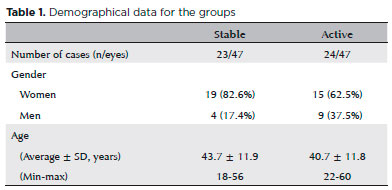 Results: Twenty-four patients were int he active group, whereas 23 patients were in the stable group. Choroidal thickness was significantly higher in the subfoveal and temporal macular regions in the active group. Although the nasal macular and peripapillary values were also higher in the active group, the difference was insignificant.