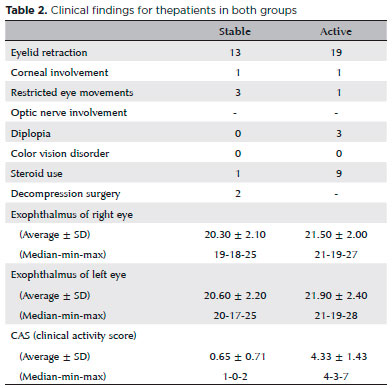 Clinical findings for the patients are summarized in table 2 as well as the Hertel exophthalmometry values and comparisons between the groups. The mean value for the stable group was lower than that for the active group, but the difference was insignificant (p=0.06).