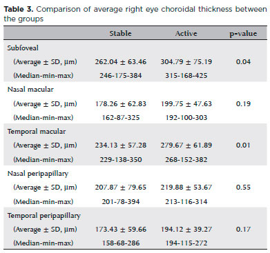 Resultados: Vinte e quarto pacientes estavam no grupo ativo, enquanto 23 pacientes estavam no grupo estável. A espessura da coroide foi significativamente maior nas regiões macular subfoveal e temporal no grupo ativo. Embora os valores maculares e peripapilares nasais também fossem maiores no grupo ativo, a diferença foi insignificante.