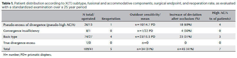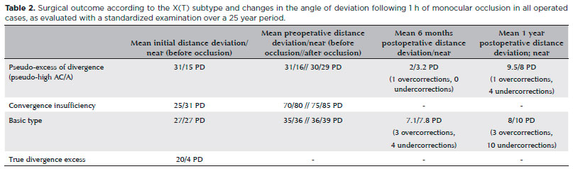 The indicated surgery was based on the classification that was determined in accordance with the results of the proposed protocol. Thus, basic type X(T) and the convergence insufficiency type were corrected by monocular recession and resection. In the pseudo-excess of divergence type, monocular recession and resection or bilateral lateral recession were performed.