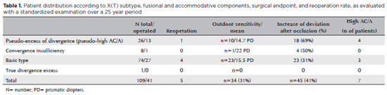 The majority of the cases in Kushner’s study(4) had the pseudo-excess of divergence type, whereas most of the cases in the present study had the basic type, as demonstrated in other studies(7,9). TPF was found in all patients with pseudo-excess of divergence, in agreement with the results of the referred author. However, the true excess divergence type is unusual when the measure is made in accordance with the protocol(1,10).