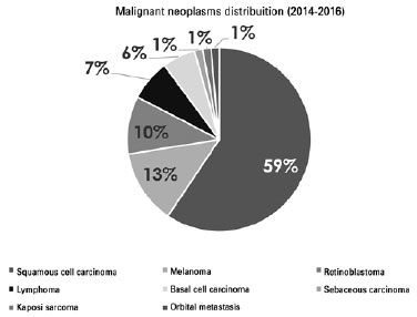 Results: Two hundred and twenty-one patients were included on this study: 160 (72%) patients came from the city of Manaus, 52 (24%) from other cities in Amazonas, and 9 (4%) from other states. Of the 221 patients, 150 (68%) were afflicted with benign lesions and the remaining 71 (32%) had malignant lesions. Benign diagnosis included pterygium, chalazium, conjunctival nevus, and papilloma, cataract, and retinal detachment. Of the malignant cases, squamous cell carcinoma (SCC) of the conjunctiva was the most frequent with 43 cases (60%). Other diagnoses included choroidal melanoma (8 cases, 11%), retinoblastoma (7 cases, 9%), lymphomas (5 cases, 7%), basal cell carcinomas of the eyelid (4 cases, 5%), conjunctival melanoma (2 cases, 2%), and Kaposi sarcomas (1 case, 1%). Of the 43 patients with SCC, the mean age was 62 years old, and 30 (69%) were male; 29 patients (67%) were treated with an excisional biopsy, and 14 (33%) were treated with neoadjuvant topic chemotherapy, followed by surgery.