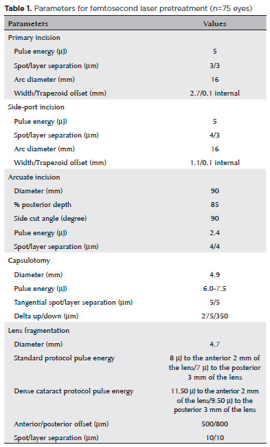 The femtosecond laser-assisted pretreatment included main corneal incision, side port corneal incision, capsulotomy, and lens fragmentation. Depending on the preoperative corneal astigmatism, an arcuate incision was also made. The energy used to perform the main incision and the side port incision was 5 µJ. The energy used to make the capsulotomy varied from 6.00 to 7.50 µJ, with 0.5-µJ intervals, and was adjusted during surgery with the objective of avoiding incomplete capsulotomies. The delta up and delta down were preset to 275 µm and 350 µm, respectively, and were altered according to the discretion of the surgeon who made adjustments in the laser parameters intraoperatively. Table 1 shows the femtosecond laser parameters that were used.