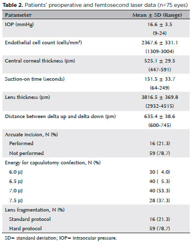 Finally, 75 eyes of 70 patients were analyzed in this study. The participants’ mean age was 69.3 ± 7.9 years (range, 50-90 years); 49 (70.0%) were women; 38 (54.3%) had hypertension; and 17 (24.3%) had diabetes mellitus. The patients’ preoperative and femtosecond laser data are shown in table 2. Nine (12%) eyes evolved with a pupillary diameter that was smaller than the programmed capsulotomy diameter after the laser pretreatment and before moving the patient into the operating room for phacoemulsification. In these eyes, the re-dilation technique was applied before proceeding with cataract extraction.