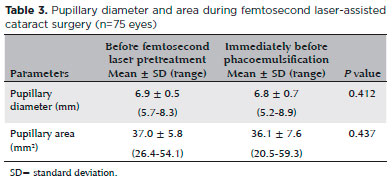Table 3 shows the pupillary diameter and area of all the eyes before the laser pretreatment and immediately before opening the wounds for phacoemulsification. The mean pupillary diameter and area did not significantly differ between these two surgical time points (p=0.412 and 0.437, respectively), even in the subgroup comparison between eyes that did not need the re-dilation and those in which the technique was used. The mean pupillary diameter before laser application and before phacoemulsification in the first subgroup was 6.9 ± 0.6 mm and 6.9 ± 0.7 mm, respectively, (p=0.4) and the mean pupillary area was 37.2 ± 6.0 mm2 and 37.1 ± 7.2 mm2, respectively (p=0.5); a similar comparison in the second subgroup showed a mean pupillary diameter of 6.8 ± 0.5 mm and 6.4 ± 0.8 mm, respectively (p=0.1) and a mean pupillary area of 35.8 ± 5.3 mm2 and 31.9 ± 7.9 mm2, respectively (p=0.1). Both subgroups had statistically similar mean pupillary diameter (p=0.2) and area (p=0.3) before femtosecond laser application, but they differed at the beginning of phacoemulsification with regard to both parameters (p=0.024 and 0.025, respectively).