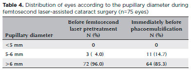 Conclusion: Preoperative administration of nonsteroidal anti-inflammatory drug and the re-dilation technique resulted in no significant pupil size variation in eyes that were pretreated with the femtosecond laser, when comparing the measurements made before the laser application and at the beginning of phacoemulsification. This approach can avoid the need to proceed with cataract extraction with a constricted pupil.