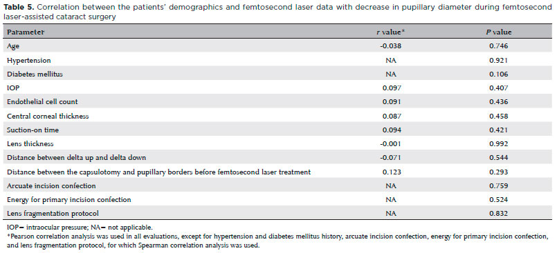 When analyzing all eyes, the overall pupillary area constriction was 2.4 mm2. The mean distance between the capsulotomy and the pupillary border did not significantly differ before femtosecond laser application and at the beginning of phacoemulsification [1.0 ± 0.3 mm (range, 0.4-1.7 mm) vs. 1.0 ± 0.4 mm (range, 0.1-2.0 mm), respectively; p=0.219]. Immediately before opening the wounds for phacoemulsification, none of the eyes presented with a pupillary diameter <5 mm, and 64 (85.3%) eyes had a pupillary diameter >6 mm. Table 4 shows the distribution of eyes with regard to pupillary diameter before the laser pretreatment and immediately before opening the wounds for phacoemulsification. None of the analyzed variables correlated with reduction in pupillary diameter when comparing the measurements made before the laser application with those at the beginning of phacoemulsification (Table 5).