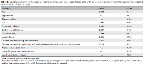When comparing the two surgical time points in this study, none of the analyzed variables correlated with reduction in pupillary diameter in the eyes that received preoperative NSAID combined with the re-dilation technique, as necessary. This result differed from the findings of a previous study that reported a correlation of the degree of miosis with patient’s age, time for lens fragmentation, and time for main incision creation, when assessing the Catalys Precision Laser System(8). These different results were probably due to the variations in the dilating regimen, the combined approach of NSAID and the re-dilation technique, and the different femtosecond laser platforms used in each study.