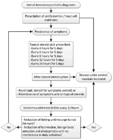 In this non-randomized study, the medical records of VKC patients being followed up at the External Diseases Outpatient Clinic of the Clinics Hospital of the State University of Campinas from February 2011 to September 2017 were retrospectively reviewed. The diagnosis of VKC was based on a clinical history of recurrent/persistent conjunctivitis associated with intense ocular itching and a marked papillary reaction with giant papillae in the upper tarsus and/or Horner-Tantras dots in both eyes. The therapeutic scheme followed a standard flowchart, as depicted in figure 1.
